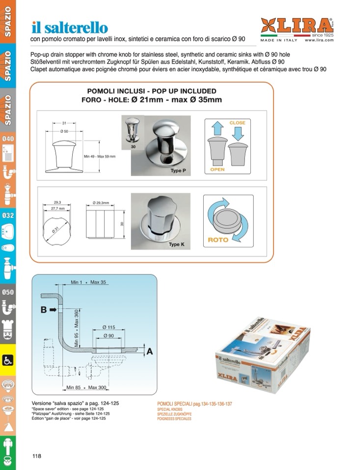 Pop-up drain stopper with chrome knob for stainless steel, synthetic and ceramic sinks with Ø 90 hole