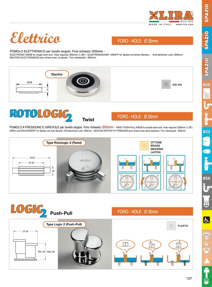 POMOLO A PRESSIONE E GIREVOLE per lavello doppio. Foro richiesto: Ø35mm - TWIST PUSH-PULL KNOB for double bowl sink. Hole required: Ø35mm (1.38”)
