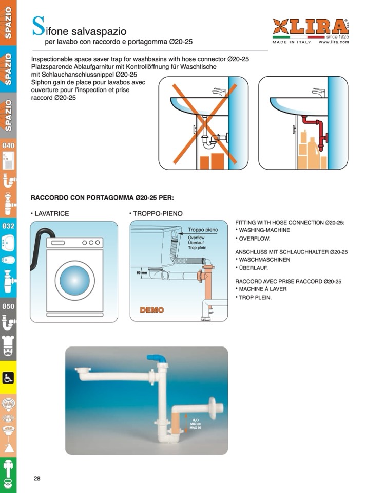 Inspectionable space saver trap for washbasins with hose connector Ø20-25