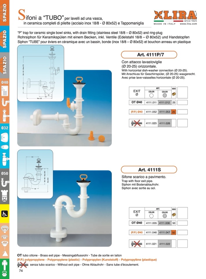 “P” trap for ceramic single bowl sinks, with drain fitting (stainless steel 18/8 – Ø 80x52) and ring-plug