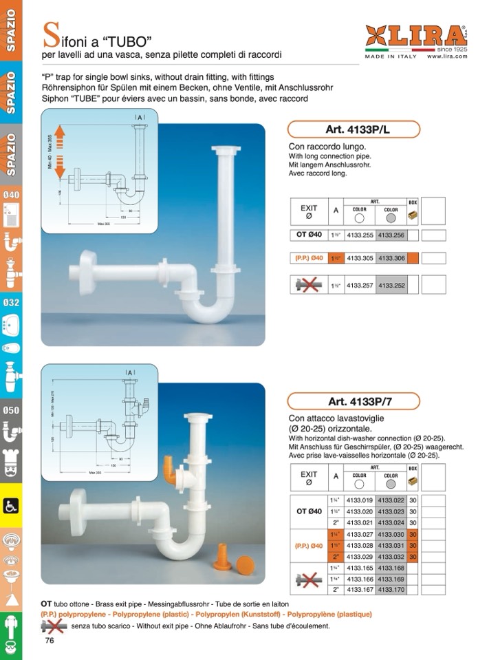 Siphon “TUBE” pour éviers avec un bassin, sans bonde, avec raccord