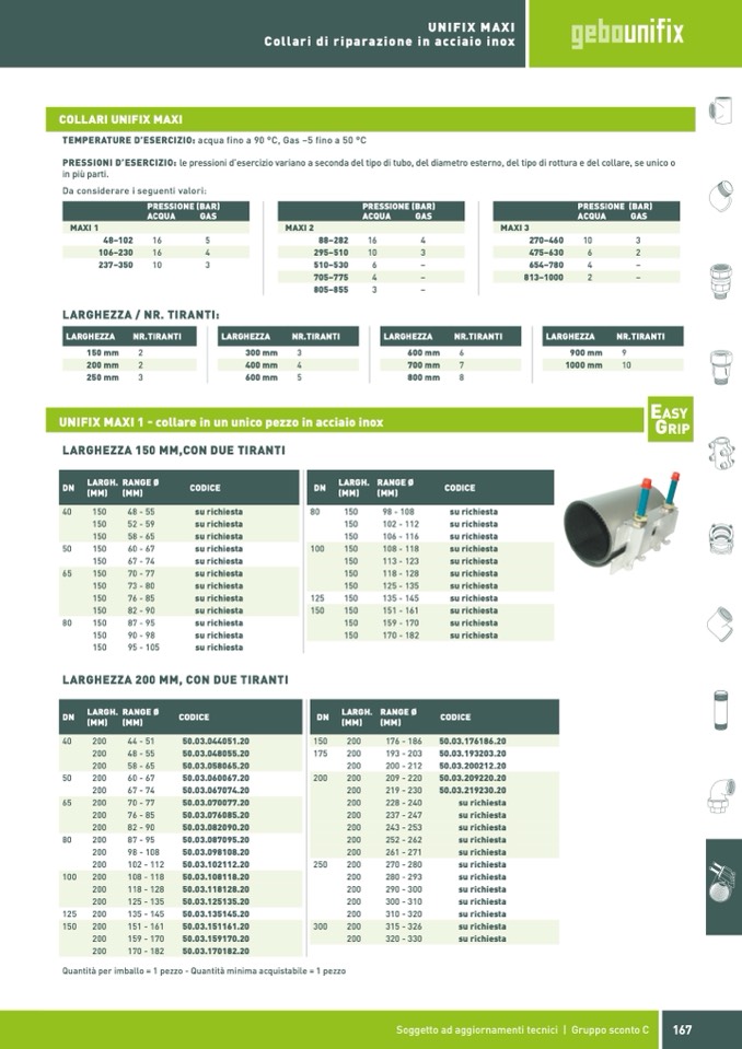 PRESSIONI D’ESERCIZIO: le pressioni d’esercizio variano a seconda del tipo di tubo, del diametro esterno, del tipo di rottura e del collare, se unico o