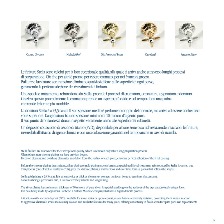 Before the chrome-plating, brass-plating, silver-plating or gold-plating process begins, a special traditional treatment, reintroduced by Stella, is carried out.