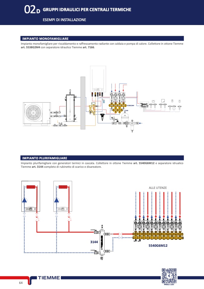 Impianto monofamigliare per riscaldamento e raffrescamento radiante con caldaia e pompa di calore. Collettore in ottone Tiemme