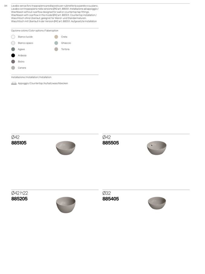 Lavabo con troppopieno nella versione Ø42 art. 885511. Installazione ad appoggio /