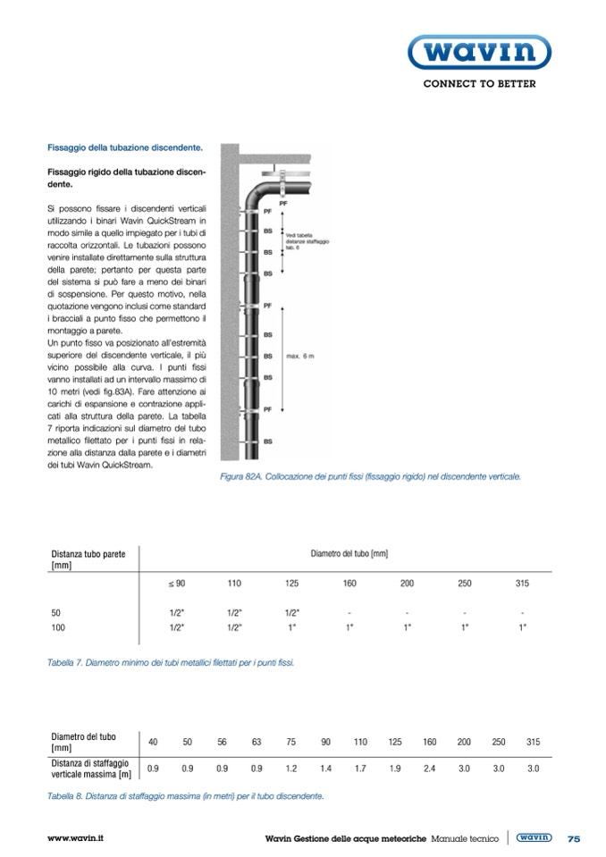 Tabella 8. Distanza di staffaggio massima (in metri) per il tubo discendente.