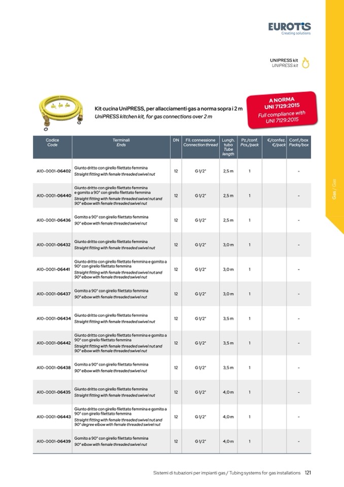 Kit cucina UniPRESS, per allacciamenti gas a norma sopra i 2 m