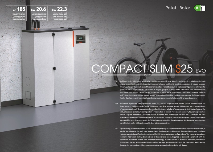 ENG Space-saving pellet boiler, thanks to the reduced depth (only 40 cm) and to the superior hydraulic connections, it