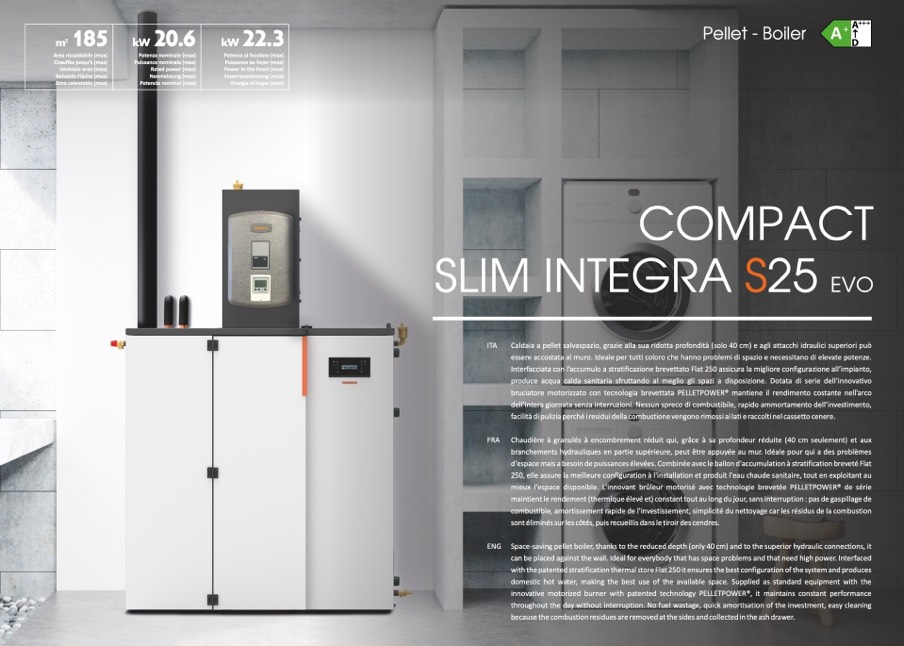 ENG Space-saving pellet boiler, thanks to the reduced depth (only 40 cm) and to the superior hydraulic connections, it
