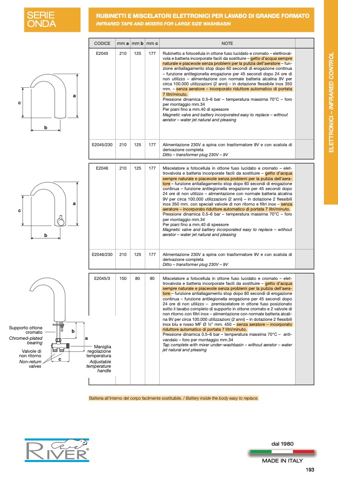 Pressione dinamica 0.5–6 bar – temperatura massima 70°C – foro