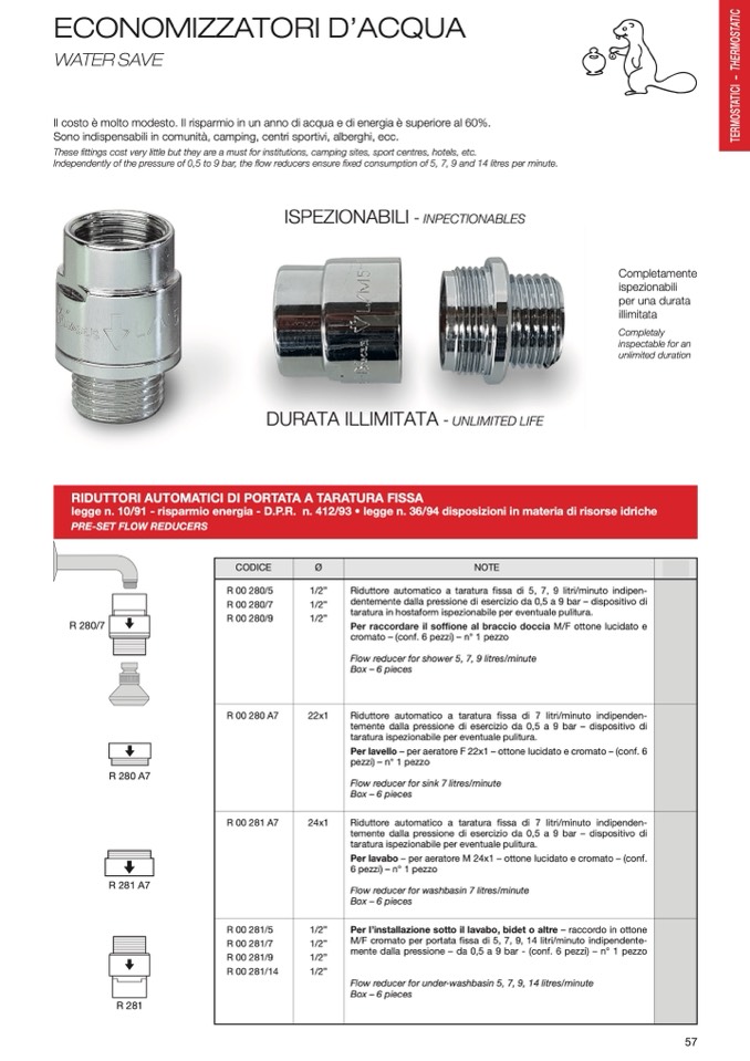 Independently of the pressure of 0,5 to 9 bar, the flow reducers ensure fixed consumption of 5, 7, 9 and 14 litres per minute.