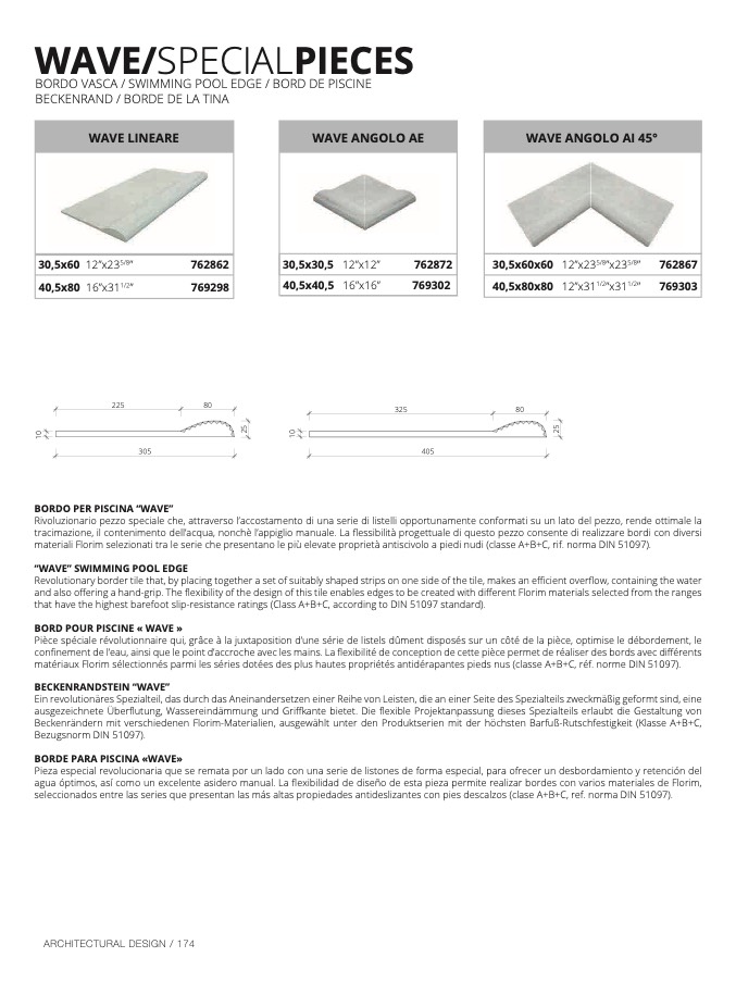 Beckenrändern mit verschiedenen Florim-Materialien, ausgewählt unter den Produktserien mit der höchsten Barfuß-Rutschfestigkeit (Klasse A+B+C