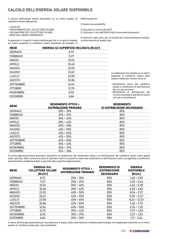 Il valore dell’energia disponibile per la produzione di acqua calda viene ottenuto moltiplicando l’energia che impatta giornalmente su un metro