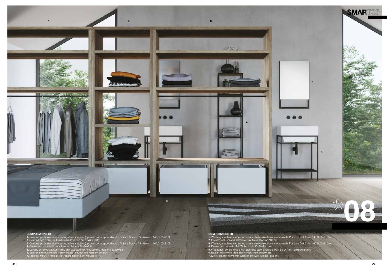 1. Washing machine + dryer column + shelves (optional clothes rail). Primitive Oak finish 145,6x65x210h cm.