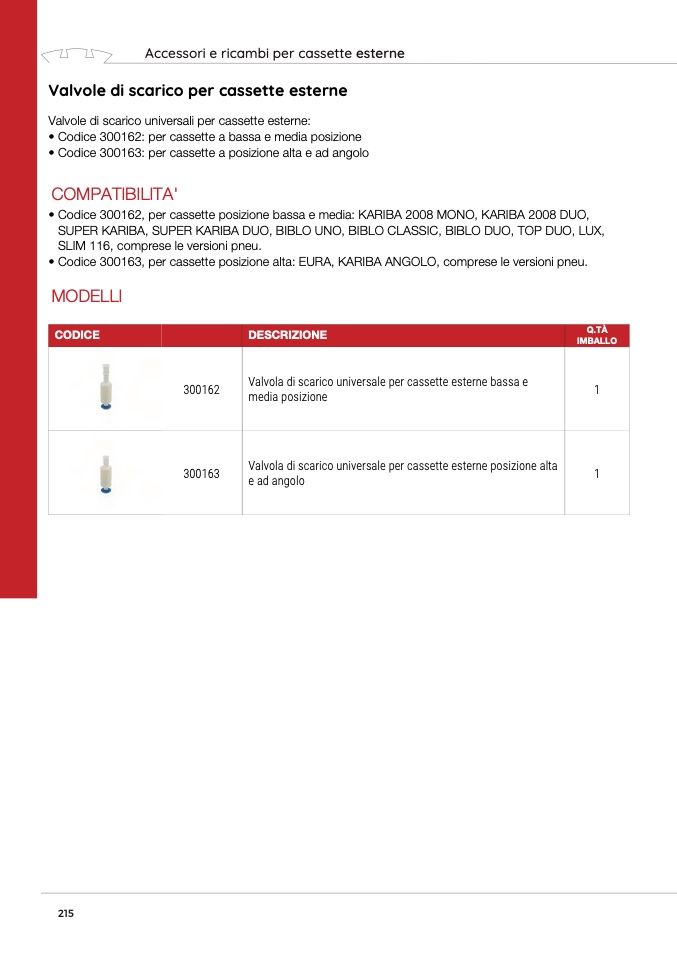 • Codice 300163, per cassette posizione alta: EURA, KARIBA ANGOLO, comprese le versioni pneu.