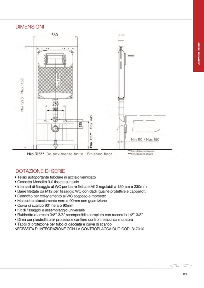• Interassi di fissaggio al WC per barre filettate M12 regolabili a 180mm e 230mm