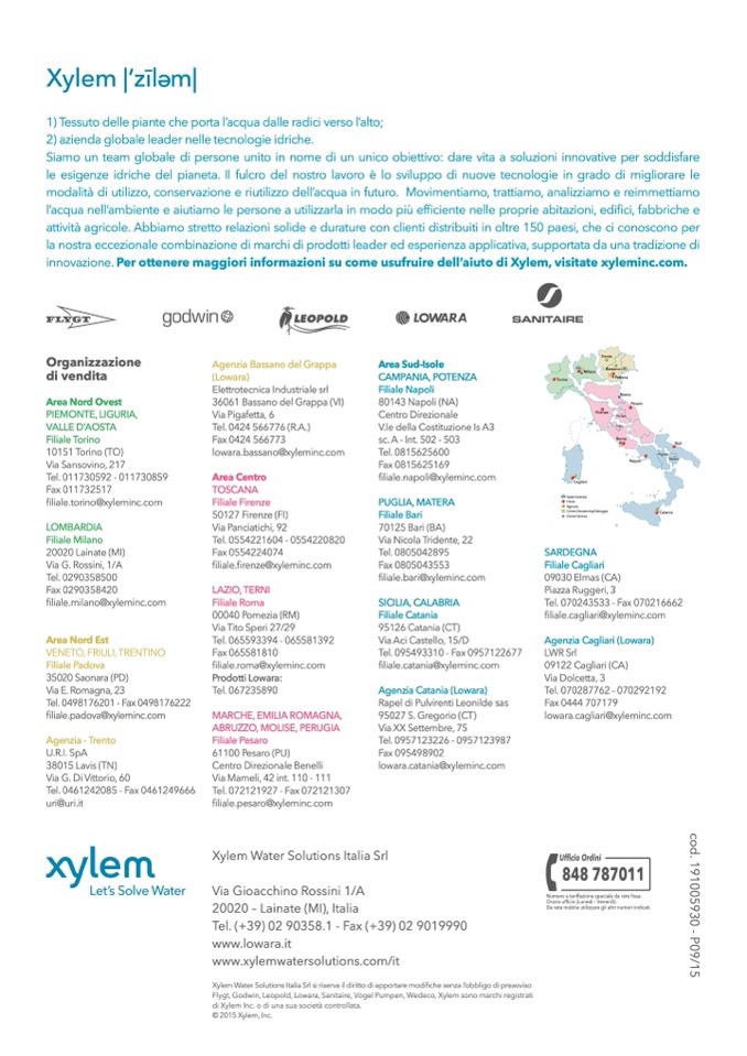 Xylem Water Solutions Italia Srl si riserva il diritto di apportare modifiche senza l’obbligo di preavviso