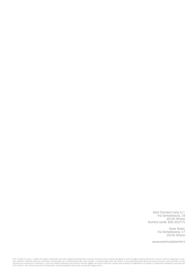 Tutti i modelli di unità e i modelli dei disegni ornamentali sono stati regolarmente depositati, eventuali imitazioni servili saranno perseguite a norma di legge. Ceramica Dolomite si riserva il diritto di apportare in qual-