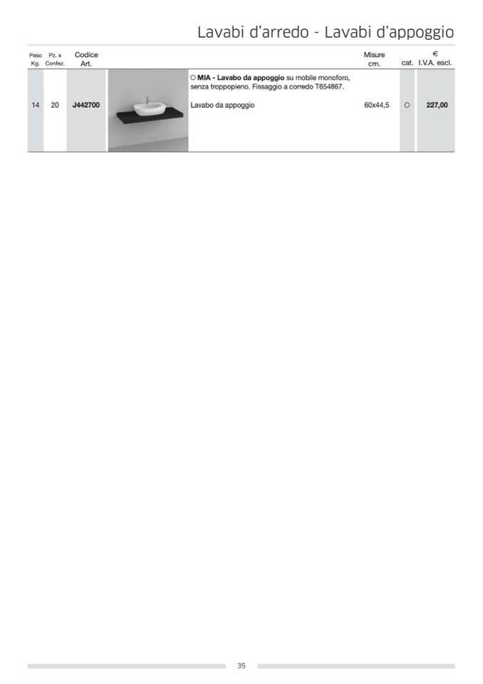 senza troppopieno. Fissaggio a corredo T654867.
