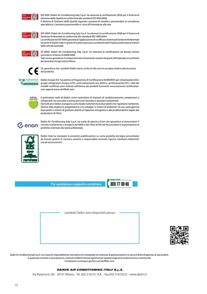 Daikin Air Conditioning Italy S.p.A. non si assume responsabilità per eventuali errori o inesattezze nel contenuto di questo prospetto e si riserva il diritto di apportare ai suoi prodotti,