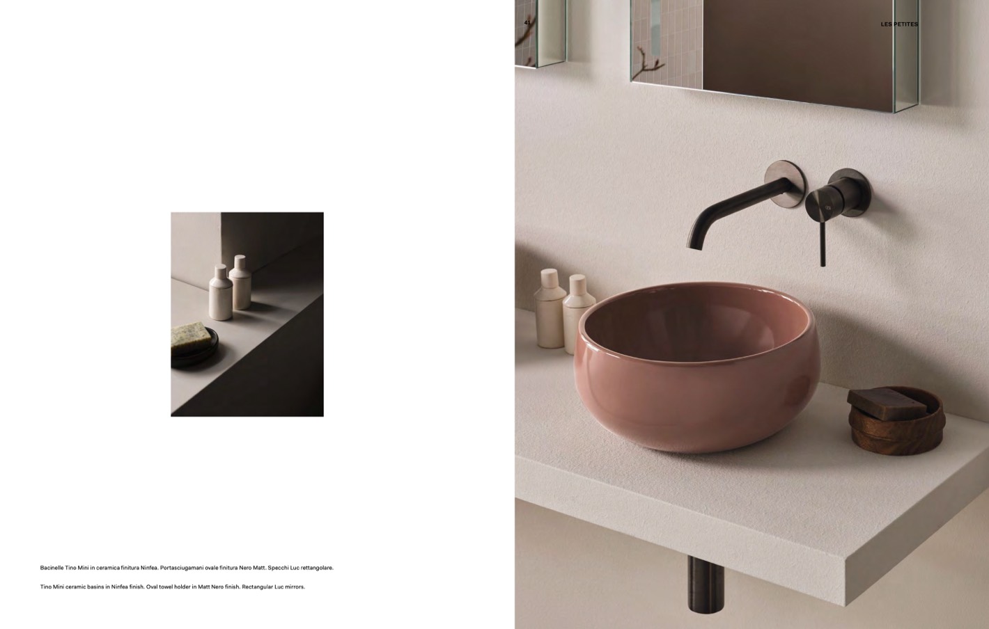 Tino Mini ceramic basins in Ninfea finish. Oval towel holder in Matt Nero finish. Rectangular Luc mirrors.
