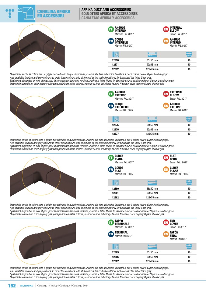 Also available in black and grey colours: to order these colours, add at the end of the code the letter N for black and the letter G for grey.