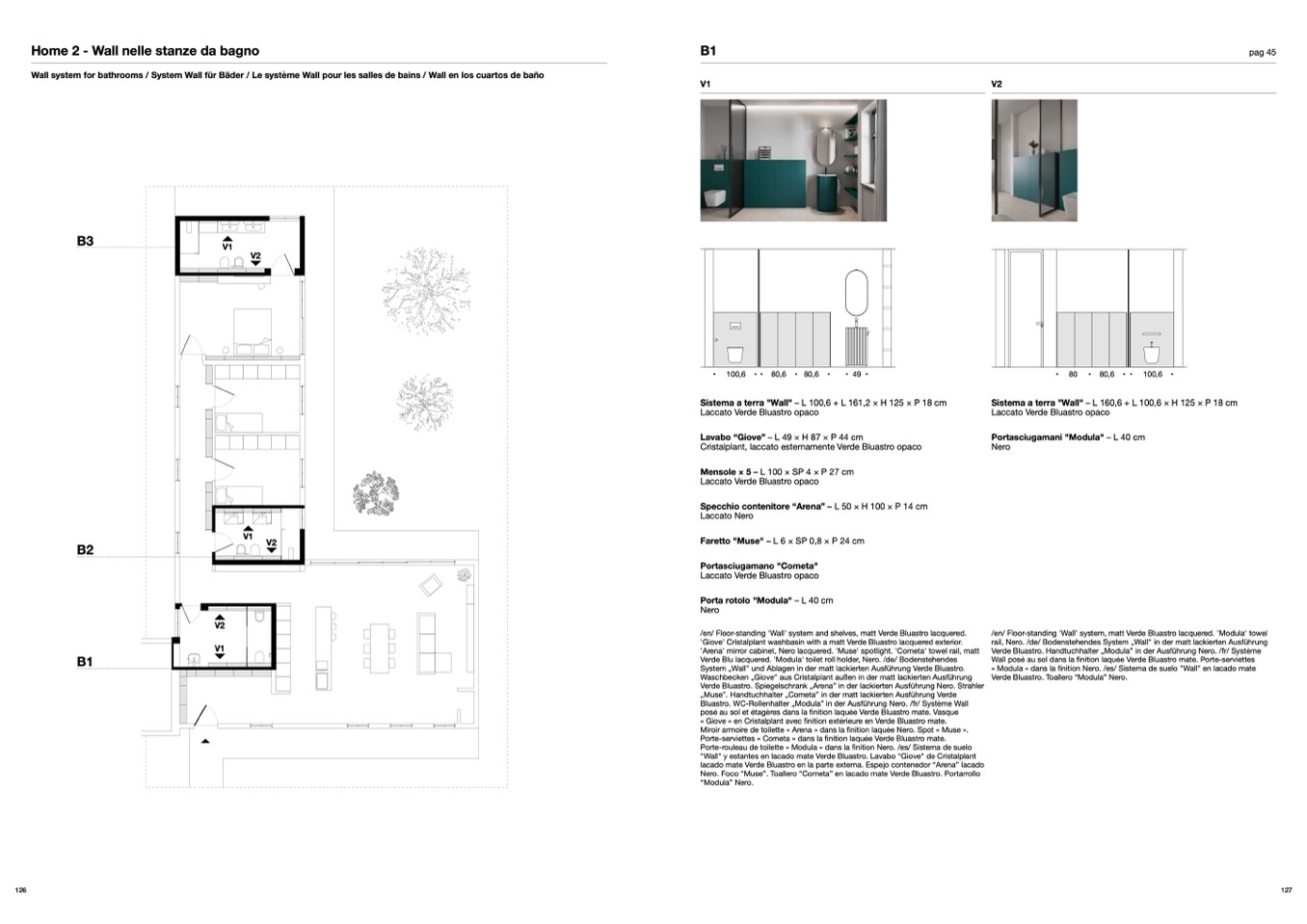 System „Wall" und Ablagen in der matt lackierten Ausführung Verde Bluastro.