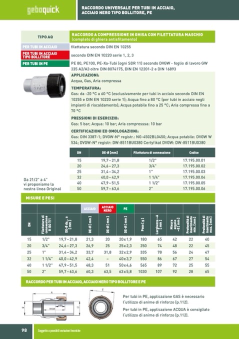 Gas: DIN 3387-1; DVGW-N° registr.: NG-4502BL0450; Acqua potabile: DVGW W