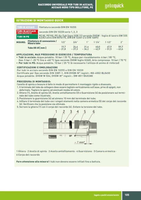 • Per tubi in PE: Acqua potabile: 10 bar / 25 °C (
