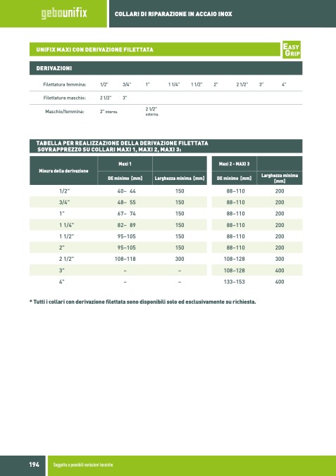 * Tutti i collari con derivazione filettata sono disponibili solo ed esclusivamente su richiesta.