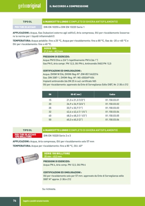 APPLICAZIONI: Acqua, Gas (tubazioni esterne agli edifici), Aria compressa, Olii per riscaldamento (osserva-