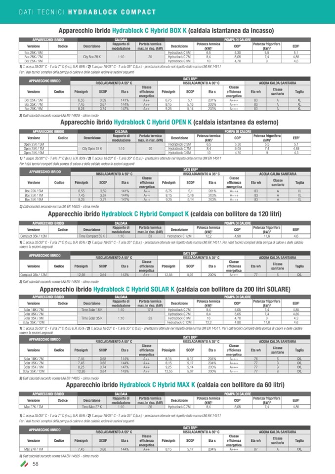 1) T. acqua 35/30° C - T aria 7° C (b.s.) U.R. 85% / 2) T. acqua 18/23° C - T. aria 35° C (b.s.) - prestazioni ottenute nel rispetto della norma UNI EN 14511. Per i dati tecnici completi della pompa di calore e delle caldaie