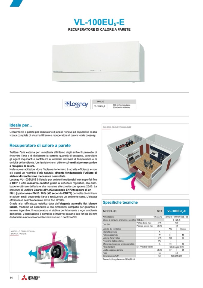 Lossnay VL-100EU5-E è l’ideale per ambienti residenziali con superfici fino