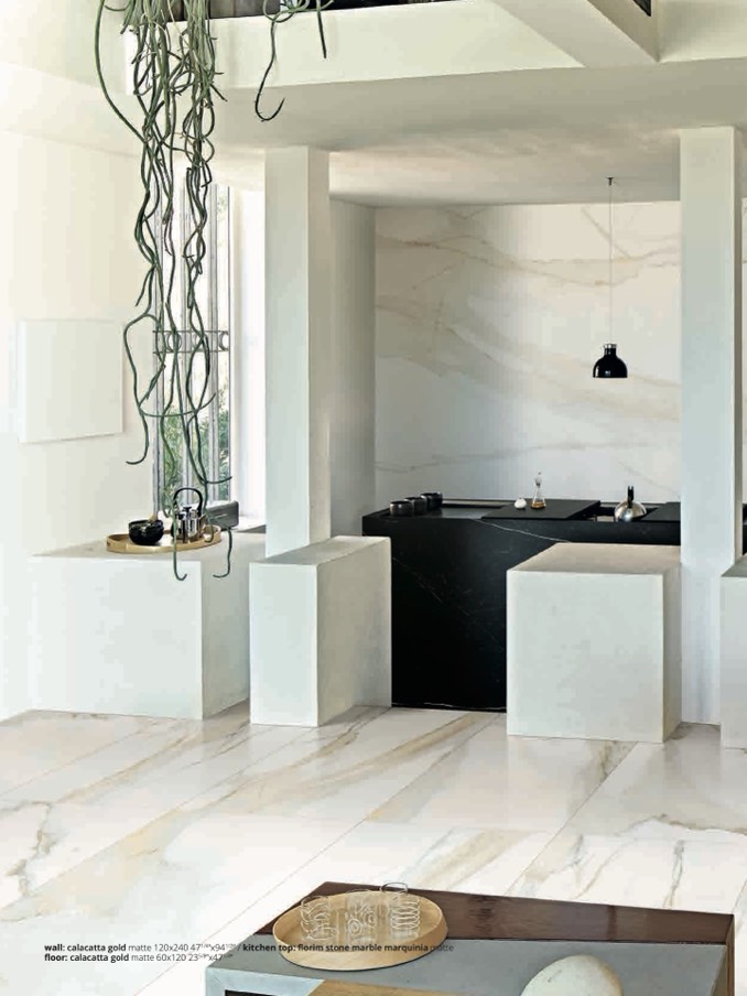 wall: calacatta gold matte 120x240 471/4”x941/2” / kitchen top: florim stone marble marquinia matt