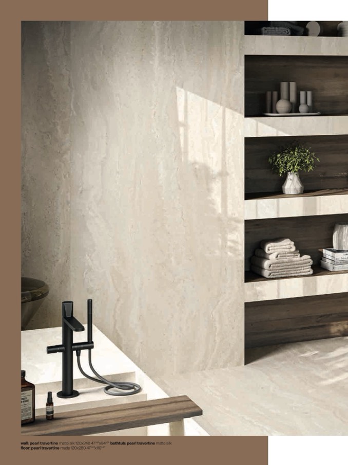 wall: pearl travertine matte silk 120x240 471/4"x941/2" bathtub: pearl travertine matte silk
