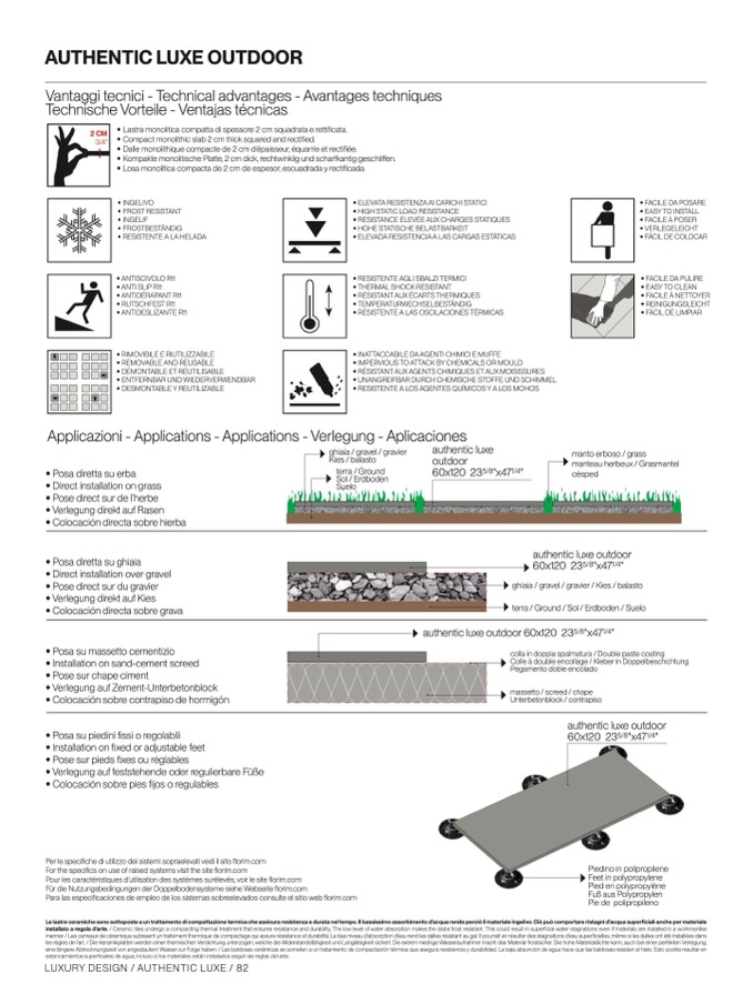 installato a regola d’arte. / Ceramic tiles undergo a compacting thermal treatment that ensures resistance and durability. The low level of water absorption makes the slabs frost resistant. This could result in superficial water stagnations even if materials are installed in a workmanlik