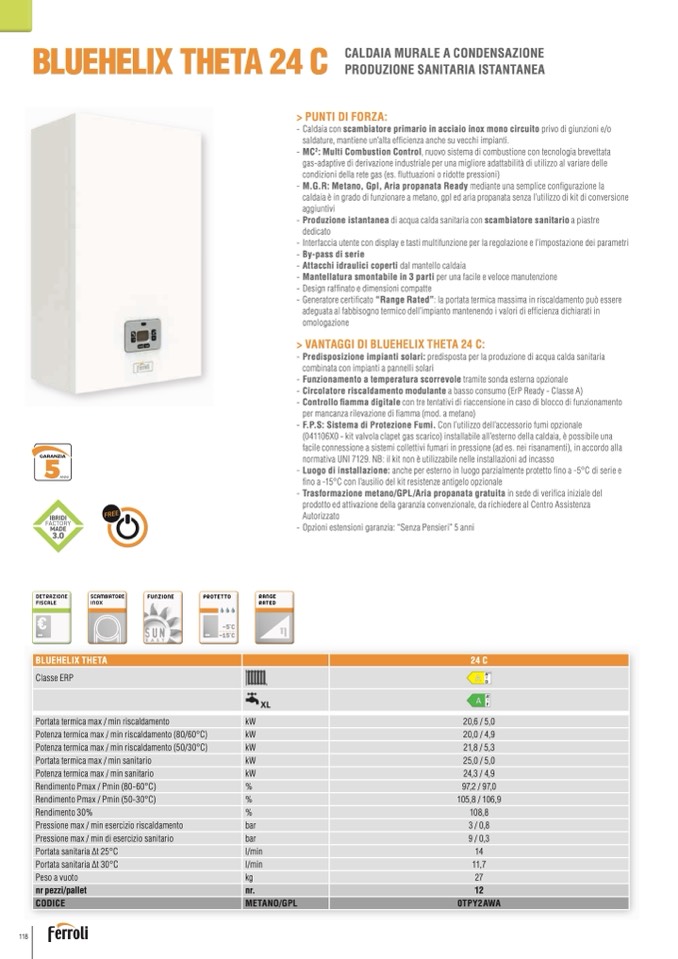 - Generatore certificato “Range Rated”: la portata termica massima in riscaldamento può essere