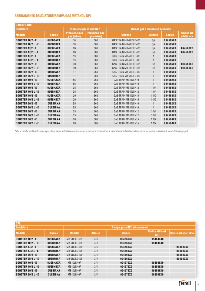 * Per la corretta scelta della rampa a gas, dovrà essere sottratta la contropressione in camera di combustione ai valori indicati in tabella (relativi a pressione minima e massima di lavoro delle rampe gas)