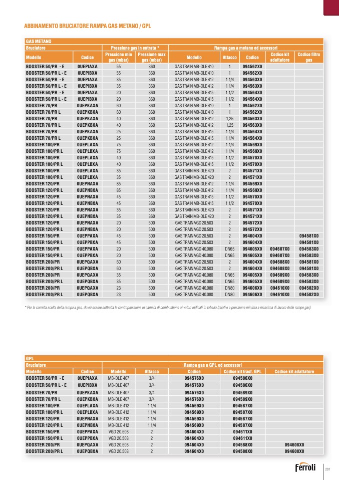 * Per la corretta scelta della rampa a gas, dovrà essere sottratta la contropressione in camera di combustione ai valori indicati in tabella (relativi a pressione minima e massima di lavoro delle rampe gas)