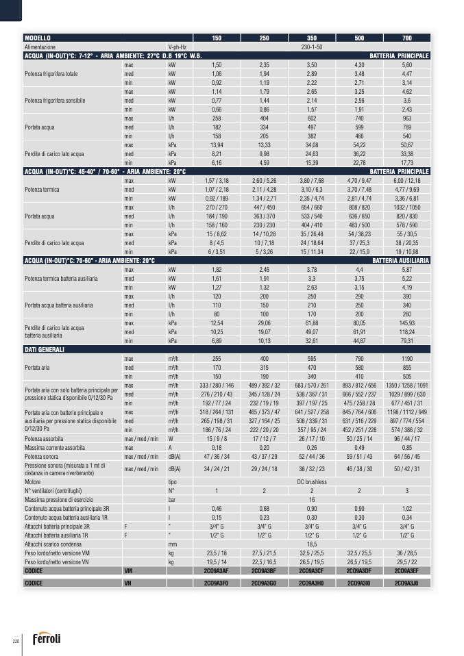 ACQUA (IN-OUT)°C: 45-40° / 70-60° - ARIA AMBIENTE: 20°C