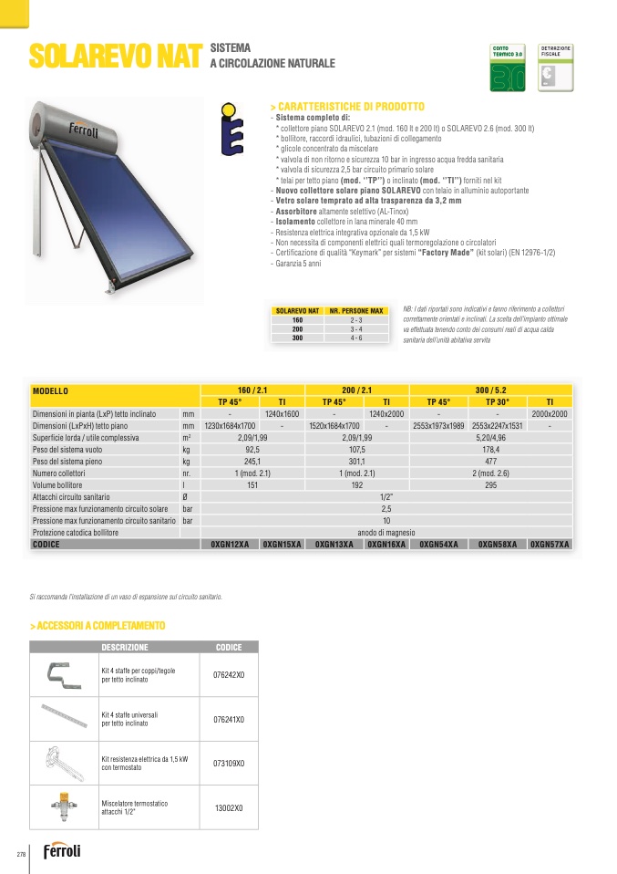 * collettore piano SOLAREVO 2.1 (mod. 160 lt e 200 lt) o SOLAREVO 2.6 (mod. 300 lt)