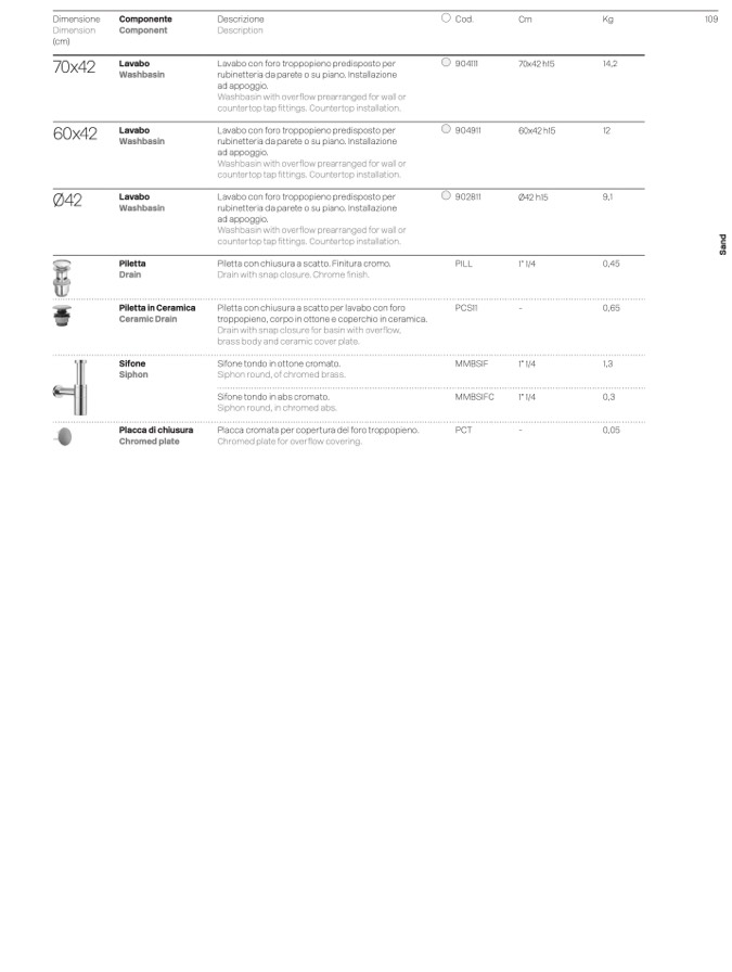 Lavabo con foro troppopieno predisposto per