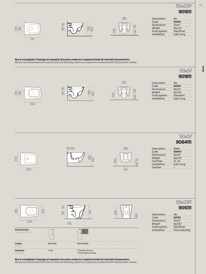 We do not recommend the use of external flushing cisterns or systems endowed with flushometer valves.