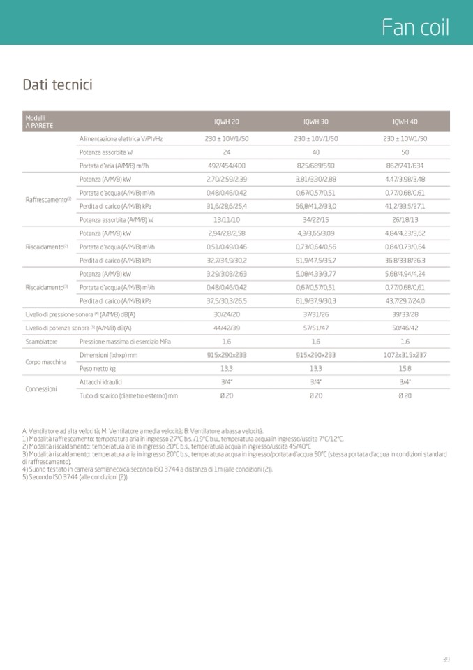 3) Modalità riscaldamento: temperatura aria in ingresso 20°C b.s., temperatura acqua in ingresso/portata d’acqua 50°C (stessa portata d’acqua in condizioni standard