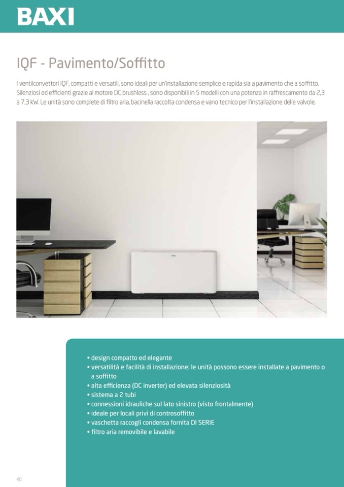 I ventilconvettori IQF, compatti e versatili, sono ideali per un’installazione semplice e rapida sia a pavimento che a so