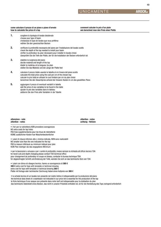 • i fori per la rubinetteria NON prevedono sovrapprezzo