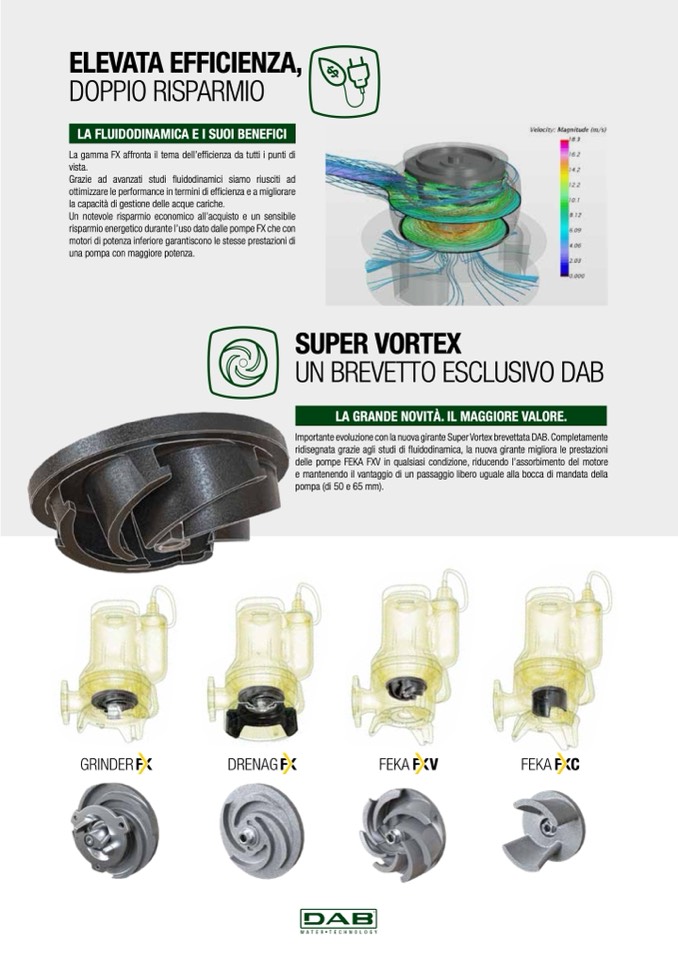 Importante evoluzione con la nuova girante Super Vortex brevettata DAB. Completamente