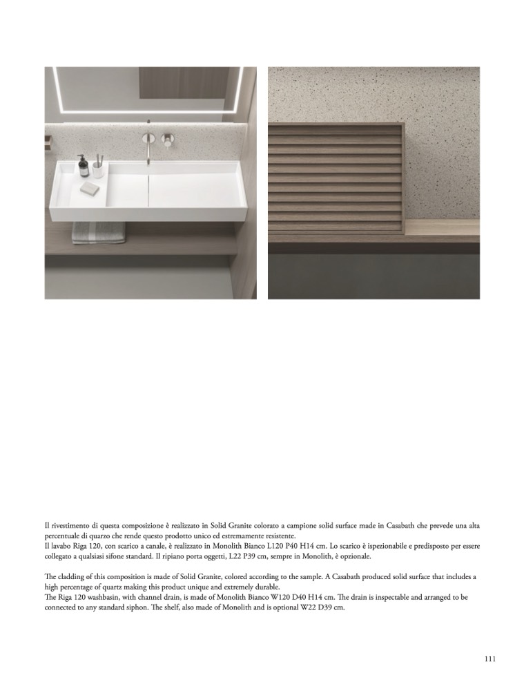 Il lavabo Riga 120, con scarico a canale, è realizzato in Monolith Bianco L120 P40 H14 cm. Lo scarico è ispezionabile e predisposto per essere