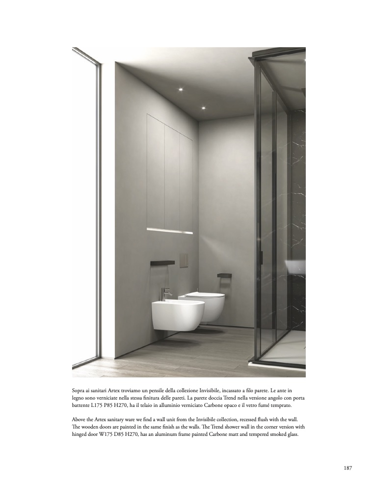 Sopra ai sanitari Artex troviamo un pensile della collezione Invisibile, incassato a filo parete. Le ante in