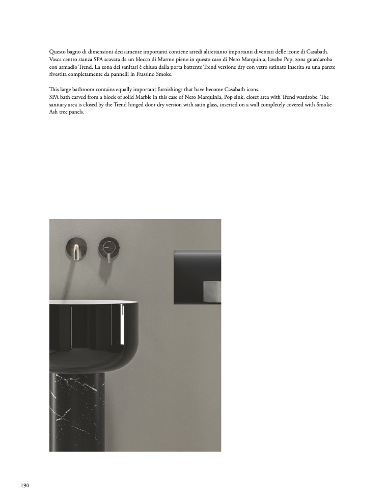 SPA bath carved from a block of solid Marble in this case of Nero Marquinia, Pop sink, closet area with Trend wardrobe. The